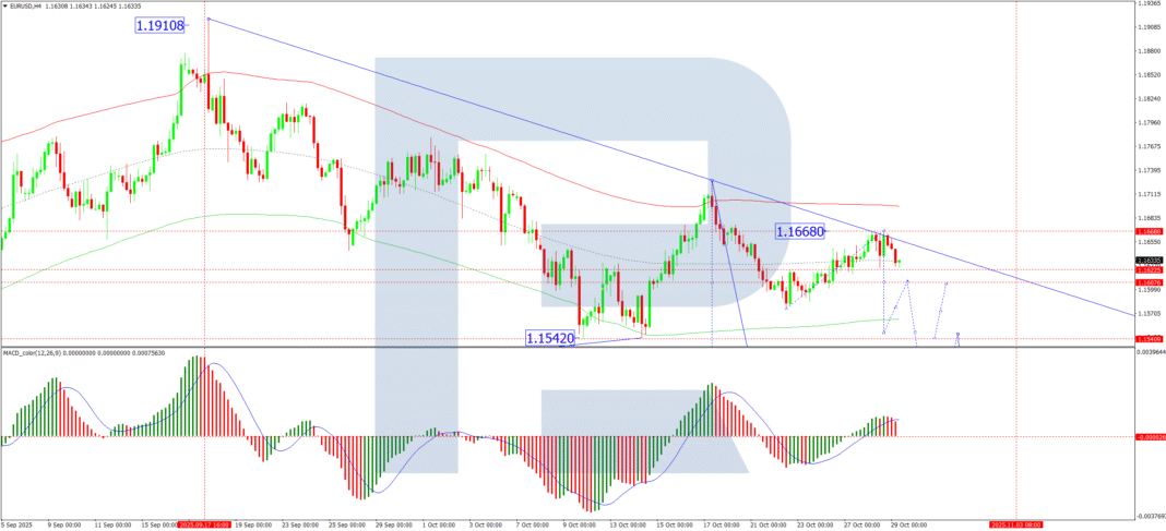 On the H4 chart, the EUR/USD pair fashioned a good consolidation vary across the 1.1600 degree. After an upward breakout, the pair accomplished a correction to 1.1680. With that correction now over, a brand new decline has begun. The subsequent goal for this bearish wave is 1.1540, which is taken into account solely the primary leg of the downtrend. Following a minor correction again in direction of 1.1600, the decline is anticipated to increase to no less than 1.1488. This situation is technically confirmed by the MACD indicator. Its sign line is above zero however has diverged from the histogram and is pointing decisively downward, indicating sustained bearish momentum.