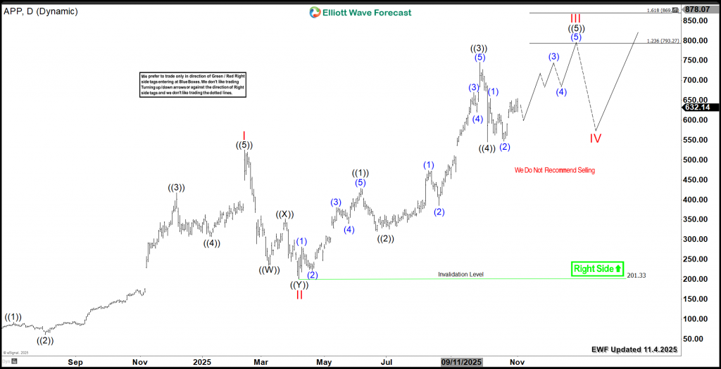 So long as value holds above wave ((4)) low at $545, APP ought to prolong larger in wave ((5)). The subsequent goal zone sits between $793 and $869. After reaching that space, APP could start a bigger wave IV correction which is predicted to supply one other shopping for alternative inside the day by day cycle towards $201 low.