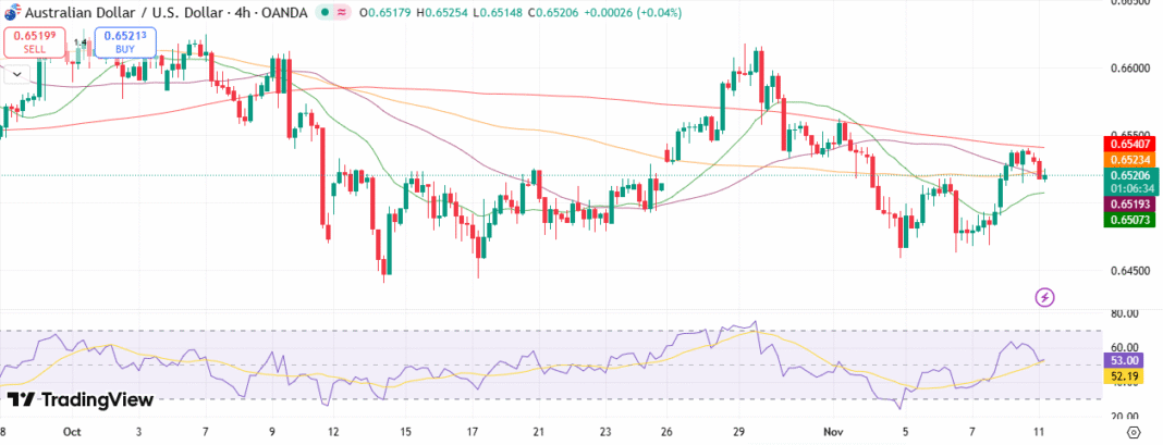 The AUD/USD 4-hour chart reveals a gentle bullish bias, because the pair trades round 0.6520 after a rebound from its earlier lows. The value stays above the 20- and 50-period MAs, hinting at modest restoration. In the meantime, the pair struggles to stay above the 200-period MA close to 0.6540, signaling a restricted upside development.