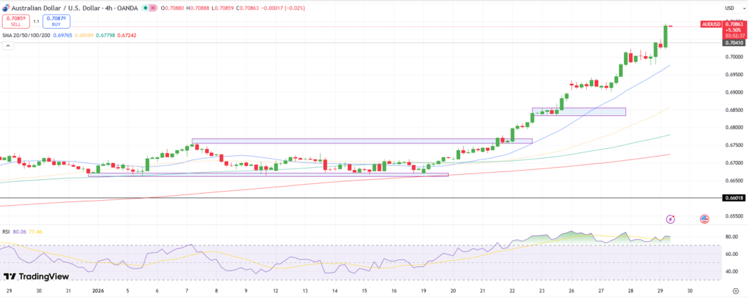 AUD/USD is buying and selling close to 0.7080 in Asia, persevering with a three-day rise amid diverging central financial institution expectations and altering danger sentiment. The pair stays supported on account of broad greenback weak point.