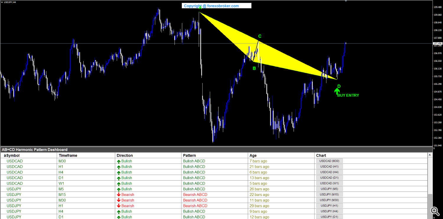 On the H4 chart, USDJPY shaped a bullish ABCD with A at a swing excessive close to 159.00, B at a swing low round 156.05, C at a retracement excessive close to 157.80, and D finishing at a swing low round 155.10. The BUY ENTRY sign appeared on the D level, providing a protracted entry after a measured pullback throughout the broader construction. The dashboard confirmed each USDCAD and USDJPY rows, demonstrating the multi-symbol scanning functionality.