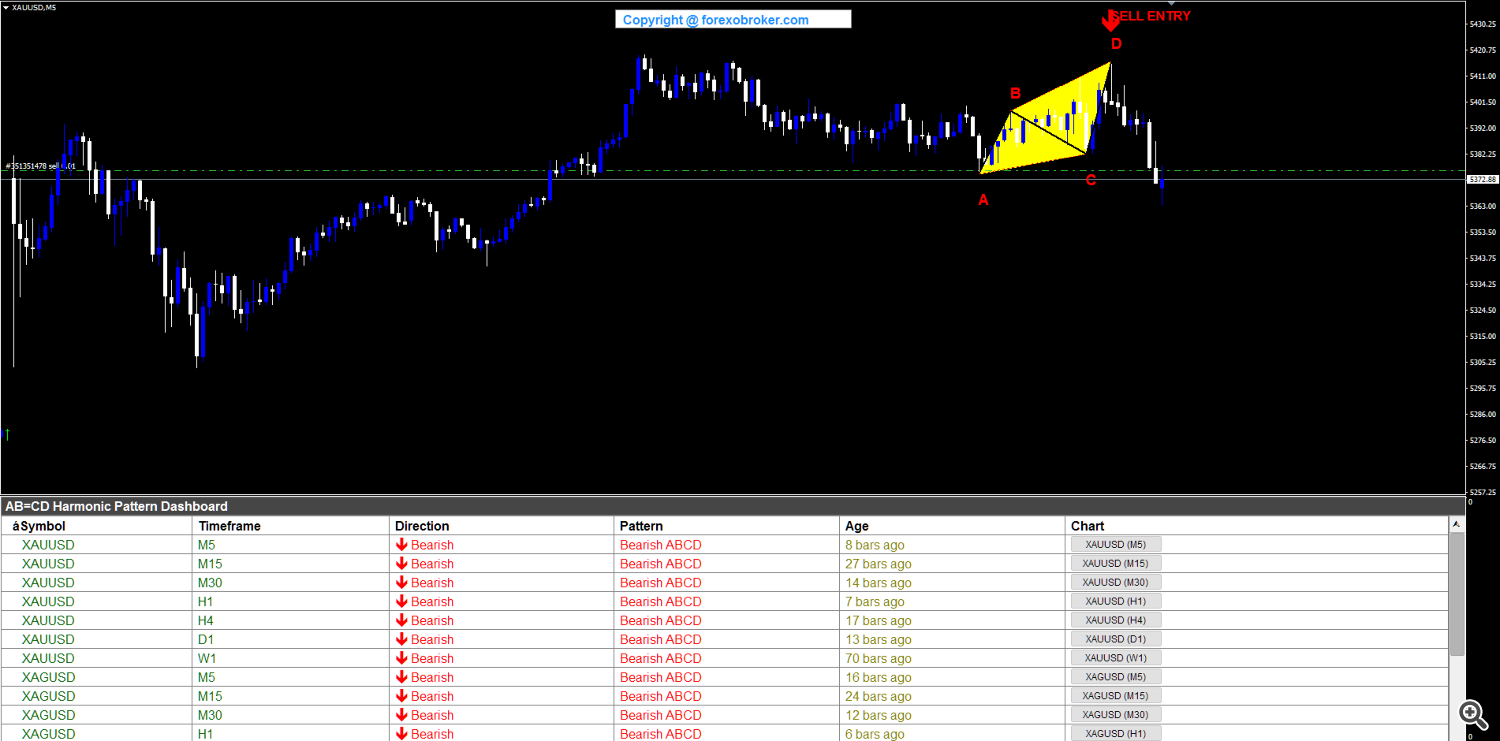 Gold on the M5 timeframe produced a compact bearish ABCD sample close to the highest of a worth transfer. The A-B-C-D sequence shaped inside a decent vary across the 5370-5420 space, with the SELL ENTRY arrow at D close to 5420. The dashboard concurrently confirmed all-Bearish readings throughout XAUUSD and XAGUSD timeframes, indicating broad bearish sentiment within the valuable metals sector.