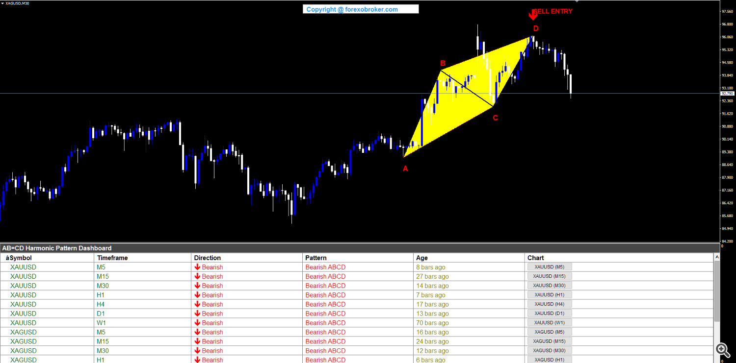 Silver on the M30 chart displayed a big bearish ABCD with well-defined swing factors. A shaped at a swing low close to 89.38, B at a swing excessive close to 93.84, C at a swing low round 91.62, and D accomplished at a swing excessive close to 96.80. The distinguished yellow triangles lined a good portion of the value vary, making the sample simple to establish visually. The SELL ENTRY at D close to 96.80 marked the sample completion in an prolonged uptrend.