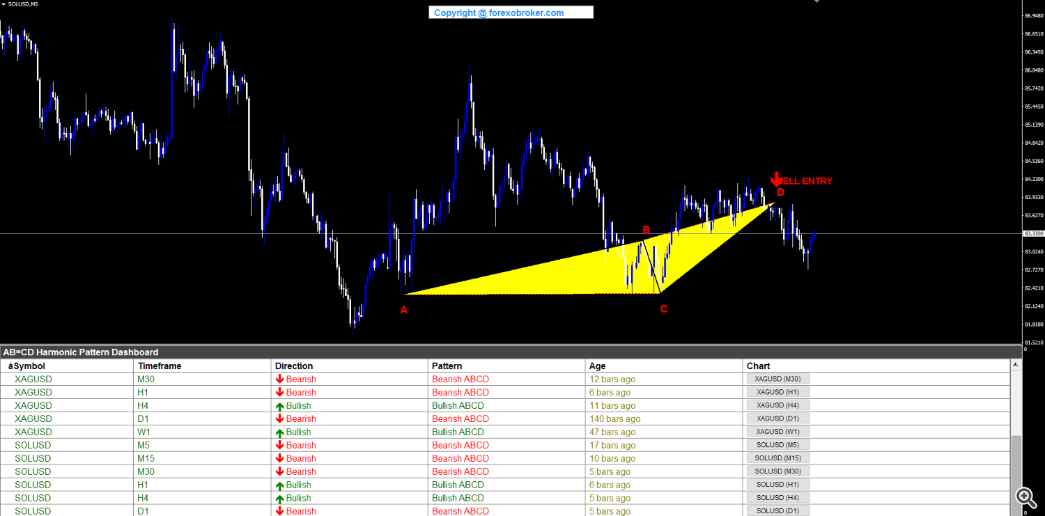 Solana on the M5 timeframe confirmed a bearish ABCD sample forming inside a downtrend. The D level accomplished close to 84.23 with the SELL ENTRY arrow marking the brief alternative. The sample’s A-B-C-D factors had been contained throughout the 82-84 vary, representing a compact scalping setup. The dashboard displayed XAGUSD and SOLUSD rows, displaying the indicator’s capacity to scan throughout totally different asset courses concurrently.