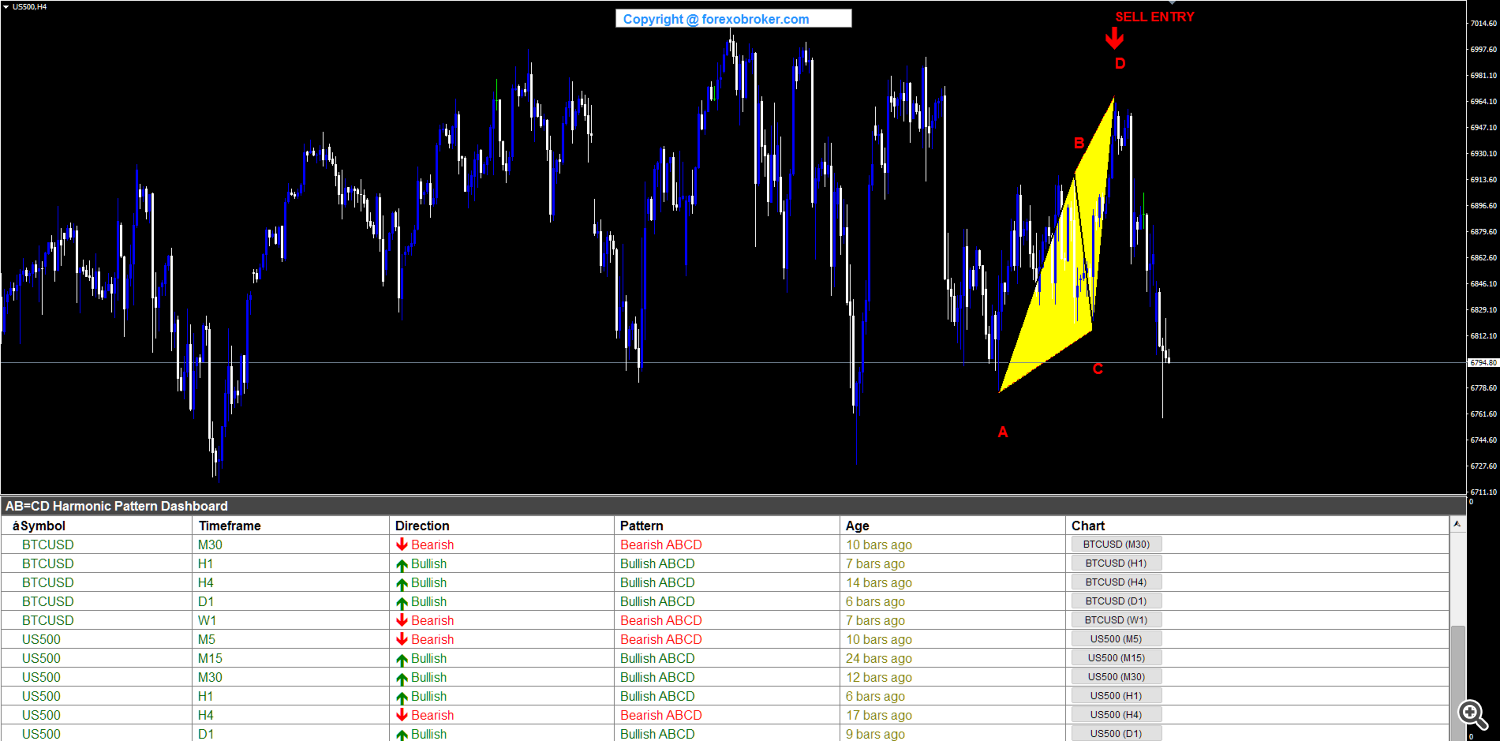 The S&P 500 index on the H4 chart shaped a bearish ABCD sample with A at a swing low close to 6,744, B at a swing excessive round 6,930, C at a swing low close to 6,794, and D finishing at a swing excessive round 6,997. The SELL ENTRY at D provided a reversal commerce on the index at a Fibonacci-defined resistance stage. The dashboard confirmed BTCUSD and US500 rows, illustrating cross-asset scanning from crypto to indices throughout the identical indicator occasion.