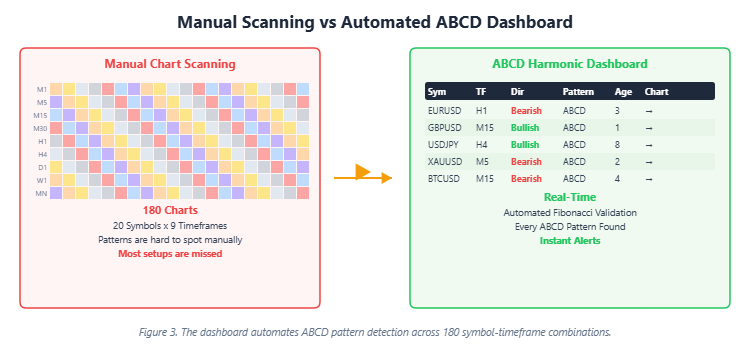 Determine 3. The dashboard automates ABCD sample detection throughout 180 symbol-timeframe combos.