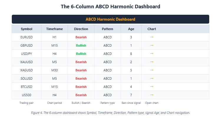 Determine 4. The 6-column dashboard reveals each detected ABCD sample throughout all monitored symbols and timeframes.