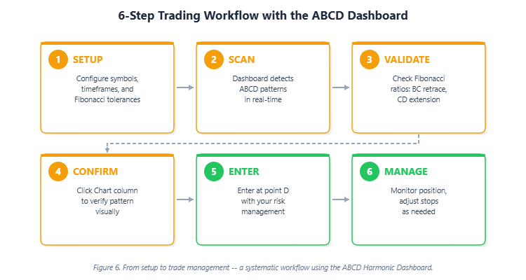 Determine 6. From setup to commerce administration — a scientific workflow utilizing the ABCD Harmonic Dashboard.
