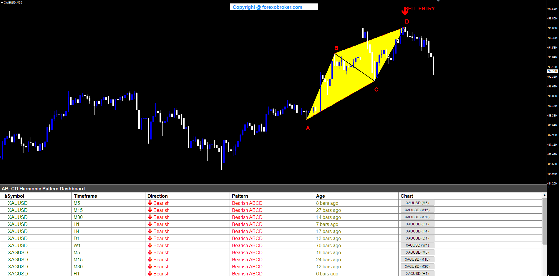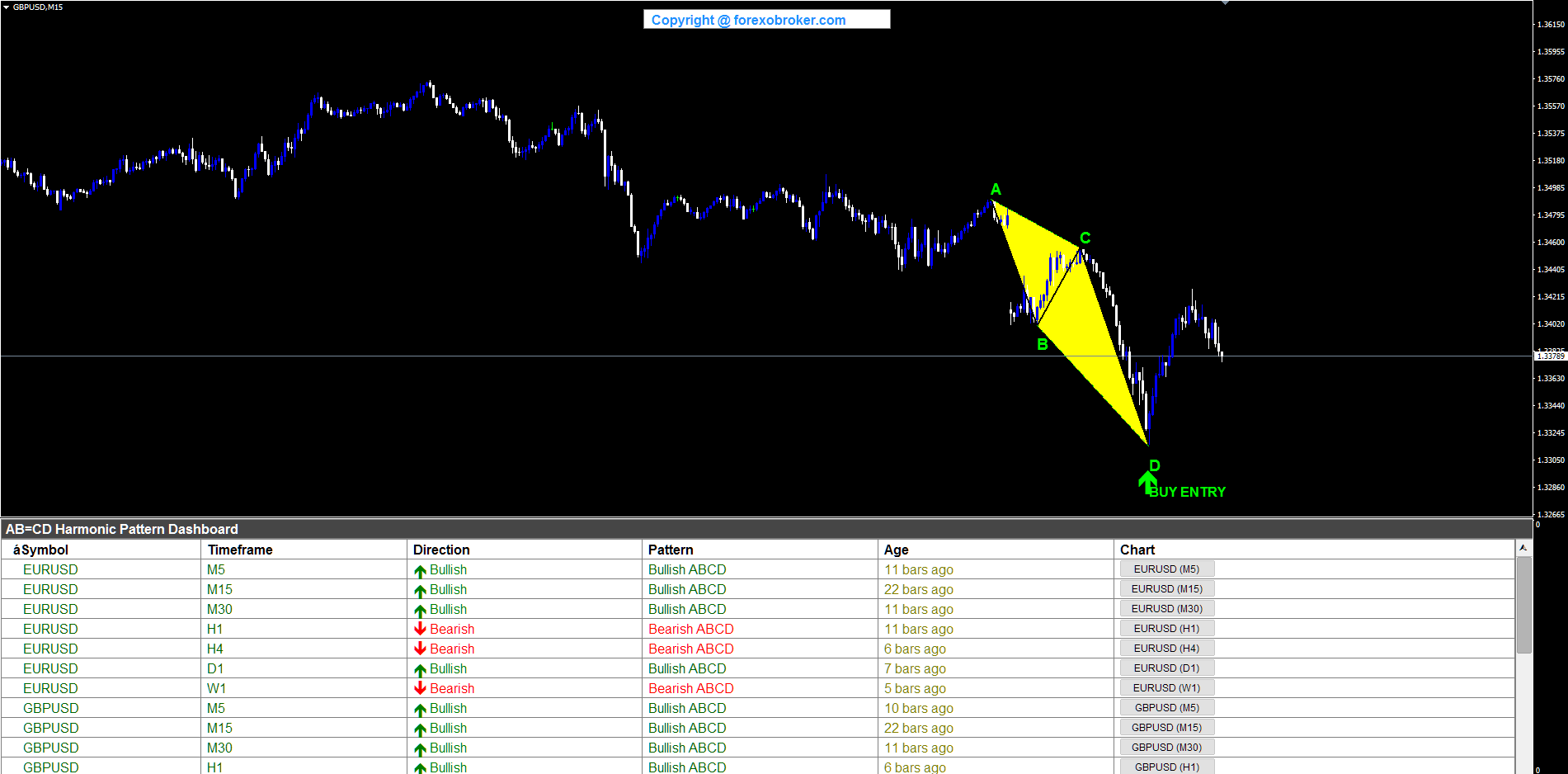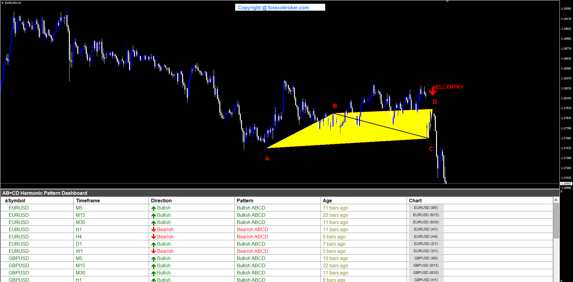 Determine 4. The 6-column dashboard reveals each detected ABCD sample throughout all monitored symbols and timeframes.