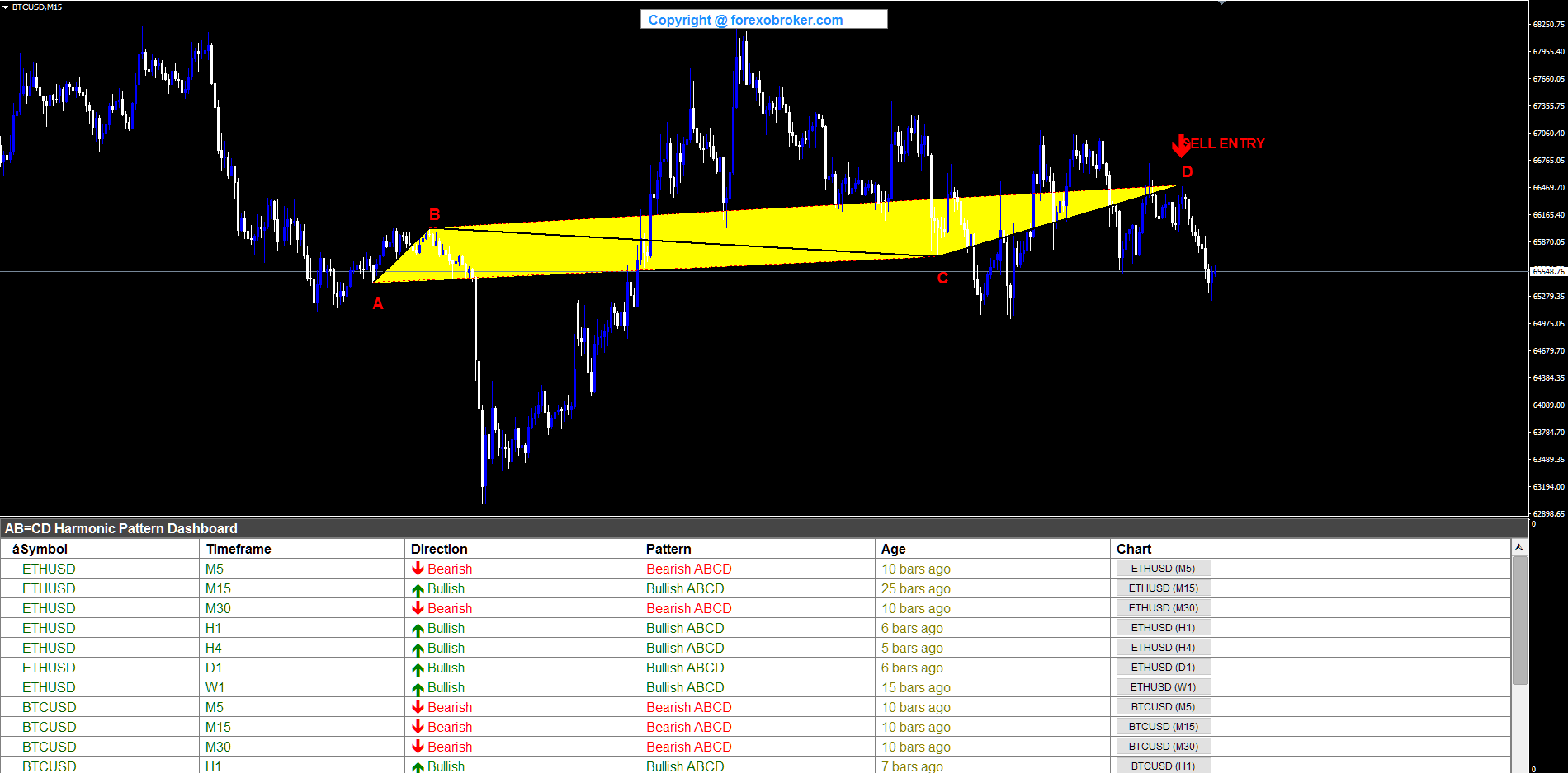 Bitcoin on the M15 chart produced a large bearish ABCD sample spanning a major worth vary. The Some extent shaped close to 65,549 (swing low), B rose to roughly 65,870, C pulled again to round 65,549, and D prolonged to the swing excessive close to 66,765. The yellow-filled triangles had been notably distinguished as a result of giant worth vary. The SELL ENTRY at D close to 66,765 was confirmed, and the dashboard confirmed ETHUSD and BTCUSD rows, demonstrating crypto market protection.
