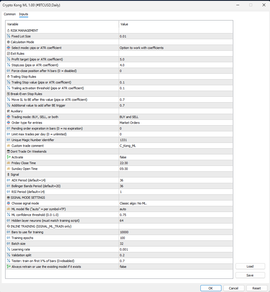 Crypto Kong ML is a robust hybrid AI knowledgeable advisor for MetaTrader 5 that mixes basic technical indicators with a customized neural community for smarter buying and selling choices.