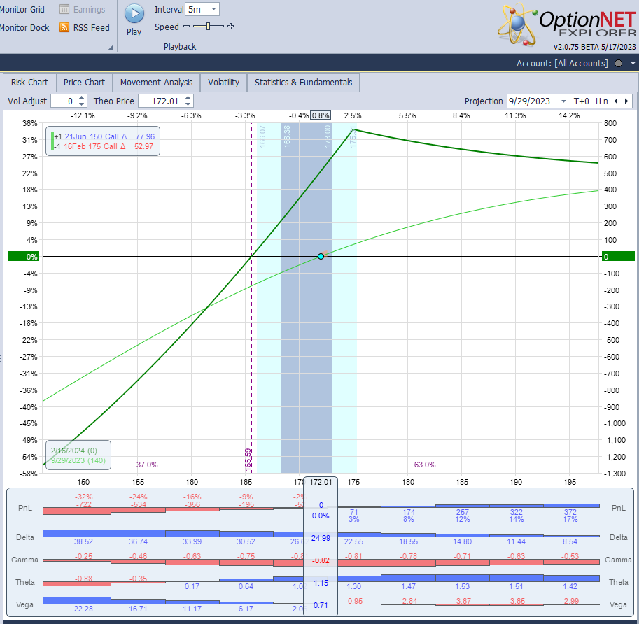 An choices dealer believes that AAPL inventory buying and selling at $172 goes to rise steadily for the following 4 months. He enters a diagonal bull name unfold by shopping for a June 2024 150 name and writing a Feb 2024 175 name for. The web funding required to placed on the unfold is a debit of $2200.