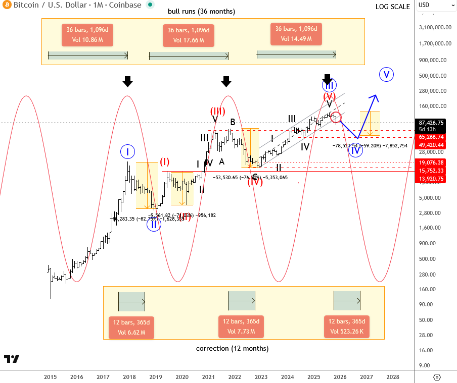 Bitcoin is reversing down from the October highs, and it’s fairly attention-grabbing that we’re seeing such a deep retracement to date, already greater than 30%, even if the Fed has been slicing charges for the previous few months and now even the bets for a December lower are growing once more. What’s vital to know is that cryptocurrencies are very delicate to risk-on and risk-off flows, and we’ve seen fairly a deep retracement on shares as properly, however what issues me essentially the most is that even throughout the days when shares turned constructive, Bitcoin was nonetheless seen buying and selling decrease. So I wished to zoom out and examine the place Bitcoin may actually be headed.When you have a look at the month-to-month chart, you’ll be able to clearly see that every bull section lasted round 36 months, precisely 3 years, and this cycle additionally accomplished proper in October, from the place a really attention-grabbing reversal began. What’s additionally vital from a cycle perspective is that corrections often final round 12 months, and primarily based on that it appears to be like like the brand new higher-degree correction may be right here and is actually not completed but.
