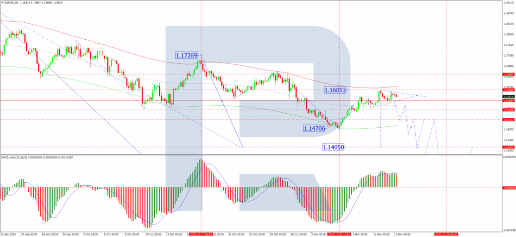 On the H4 chart, EUR/USD has accomplished a corrective wave to 1.1605 and has fashioned a good consolidation vary under this resistance stage. We anticipate a downward breakout from this vary, triggering a decline in direction of an preliminary goal of 1.1505. A breach of this stage would open the trail for an additional extension of the downtrend to 1.1405. This bearish outlook is technically supported by the MACD indicator. Its sign line is above zero however has diverged from its histogram and is pointing decisively downward, suggesting the current upward correction has run its course and bearish momentum is reasserting itself.