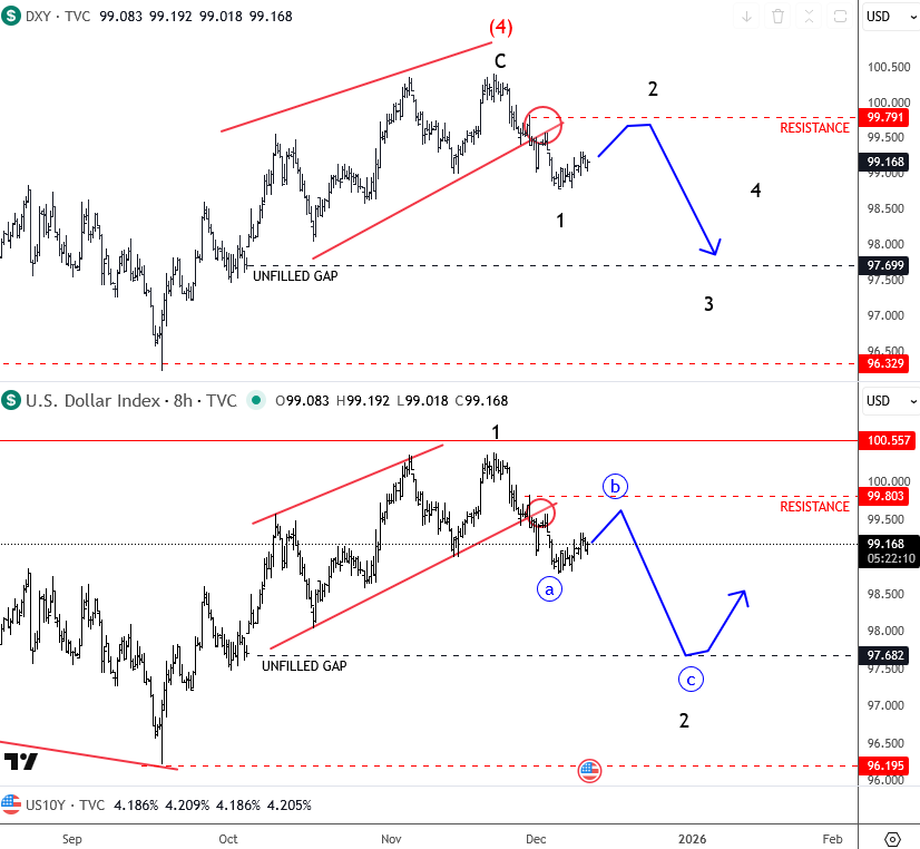 If in case you have been following our current webinars with Dale, you realize that I’ve been highlighting a wedge formation on DXY that developed from the September lows. In Elliott Wave phrases, this wedge can characterize both an ending diagonal of an A-B-C correction or perhaps a main diagonal of a brand new bullish pattern. What issues is that in each situations, I used to be searching for a reversal from above the 100 space on the Greenback Index — and now we are able to see that the wedge has been damaged, which alerts extra weak spot forward.