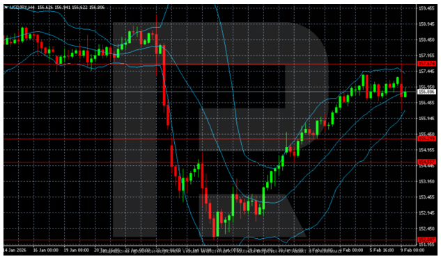 On the H4 chart for USD/JPY, following a pointy decline on the finish of January, a neighborhood backside fashioned within the 152.00-152.20 zone, from which the pair started to get well. This impulsive progress was accompanied by motion alongside the higher border of the Bollinger Bands. The value is now buying and selling beneath latest highs and consolidating within the 155.80-157.70 vary. Volatility has decreased, and the construction stays corrective. Nevertheless, momentum weakened, and the market has entered a pause part underneath resistance.