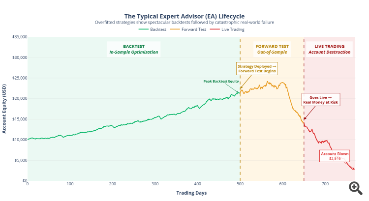 The algorithmic buying and selling house, significantly in retail markets, faces a basic credibility downside. The sample is predictable and pervasive: programs reveal spectacular backtest efficiency, adopted by speedy degradation in ahead testing, culminating in account destruction throughout reside deployment. This failure mode stems from a single root trigger—optimization for in-sample efficiency with out rigorous out-of-sample validation.