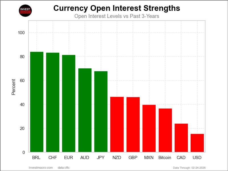 COT Power Scores (a normalized measure of Speculator positions over a 3-Yr vary, from 0 to 100 the place above 80 is Excessive-Bullish and beneath 20 is Excessive-Bearish, a 50 rating is correct down the center of the previous 3-Years) confirmed that the Canadian Greenback (100%) and the Australian Greenback (100%) lead the foreign money markets this week. The EuroFX (88 p.c), Bitcoin (78 p.c) and the Mexican Peso (67 p.c) are available in as the subsequent highest within the weekly energy scores.