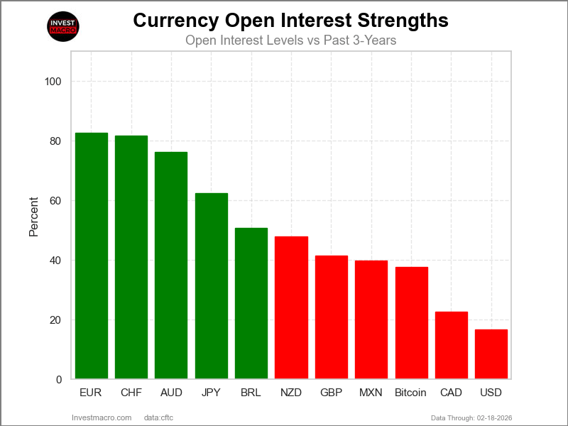 COT Energy Scores (a normalized measure of Speculator positions over a 3-12 months vary, from 0 to 100 the place above 80 is Excessive-Bullish and beneath 20 is Excessive-Bearish) confirmed that the Canadian Greenback (100%) and the Australian Greenback (100%) lead the foreign money markets this week. The EuroFX (95 %), Bitcoin (87 %) and the Mexican Peso (68 %) are available in as the following highest within the weekly power scores.