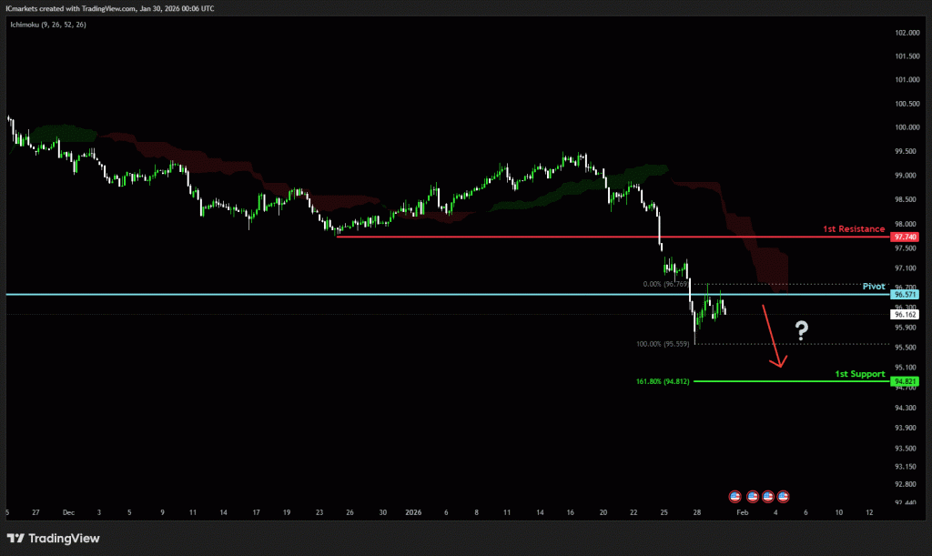 The value may see a short-term pullback towards the pivot earlier than persevering with its bearish transfer down towards the first assist.