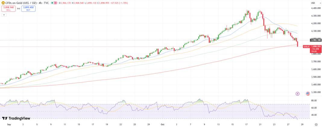 The gold forecast reveals a powerful bearish pattern because the asset traded was simply above $3,900 in Tuesday’s European session. The decline stems from the progress of US-China commerce talks. The patrons failed to carry the important thing ranges as sharp profit-taking emerged after a parabolic rise, seen within the final 4 months.