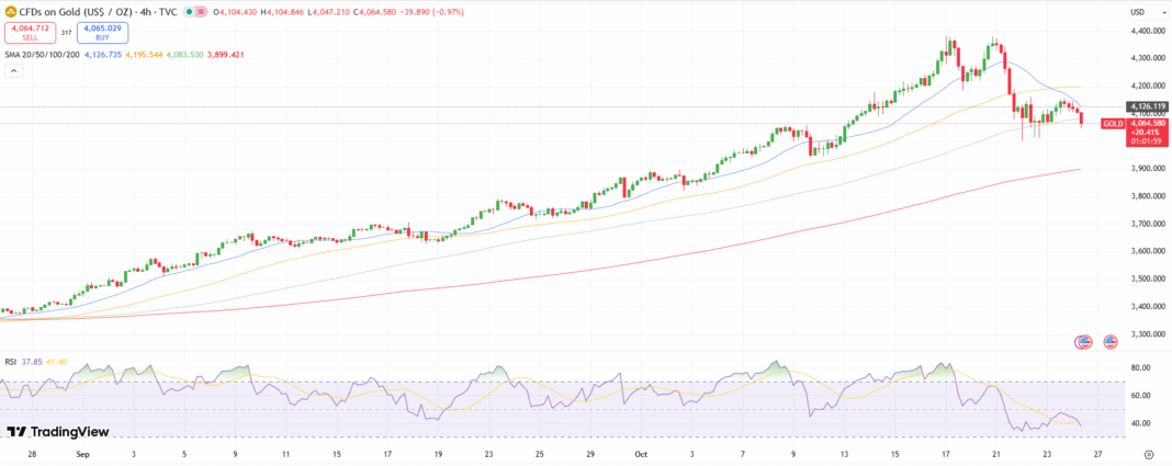 Gold’s 4-hour chart indicators a big retreat from all-time highs across the $4,380 stage. The worth consolidates beneath the 100-period MA round $4,085, suggesting a subdued bullish bias. Nevertheless, the value stays above the 200-SMA across the $3,890 stage, which may present respite to the consumers.