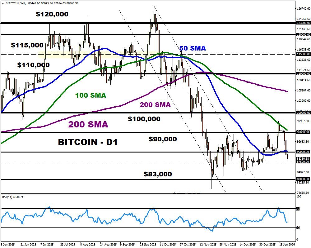 Taking a look at cryptos, Bitcoin stays beneath stress with costs buying and selling beneath $90,000.