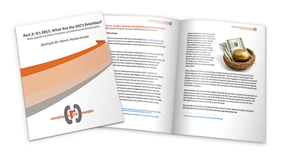 Now that now we have examined the SECs’ concentrate on Retail Traders (Half 1: It’s 2017, What Are the SEC’s Priorities?), it’s time to flip our consideration to the OCIE’s 2nd focus space: Dangers particular to Senior Traders and Retirement Investments in addition to a couple of different initiatives on the 2017 Precedence Checklist.