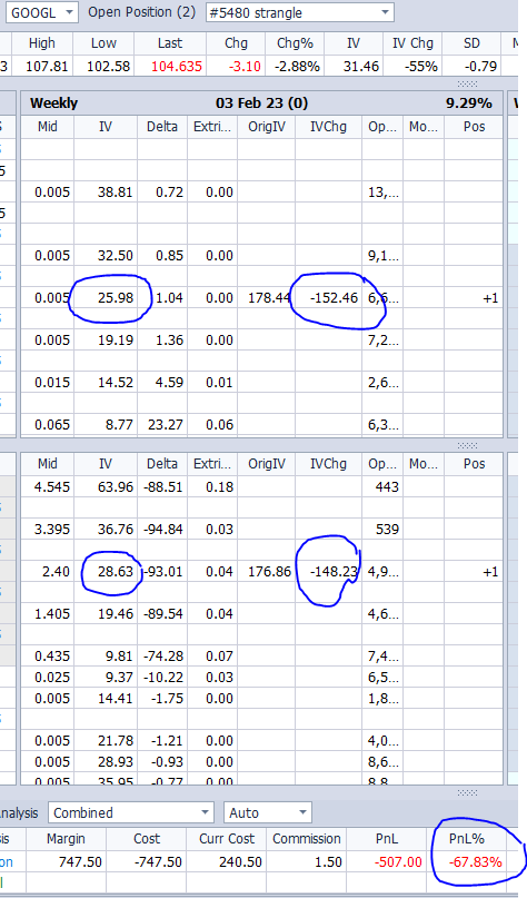 Quick ahead to the subsequent day – GOOGL moved solely 3%, the choices IV collapsed 150% and the strangle has misplaced nearly 70%.