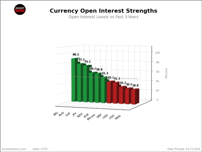 COT Energy Scores (a normalized measure of Speculator positions over a 3-Yr vary, from 0 to 100 the place above 80 is Excessive-Bullish and under 20 is Excessive-Bearish) confirmed that the Australian Greenback (91 %) and Bitcoin (91 %) lead the foreign money markets this week. The Brazilian Actual (72 %), Canadian Greenback (59 %) and the US Greenback Index (58 %) are available as the subsequent highest within the weekly energy scores.