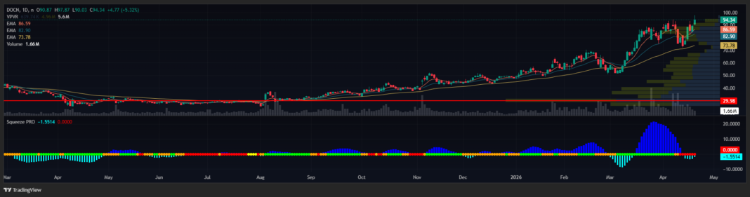 That’s the very first thing I search for earlier than the rest will get my consideration. No stacked EMAs, I transfer on. DOCN has them on each timeframe I verify.
