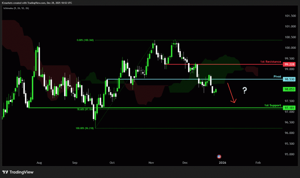 The worth may see a short-term pullback towards the pivot earlier than persevering with its bearish transfer down towards the first help.