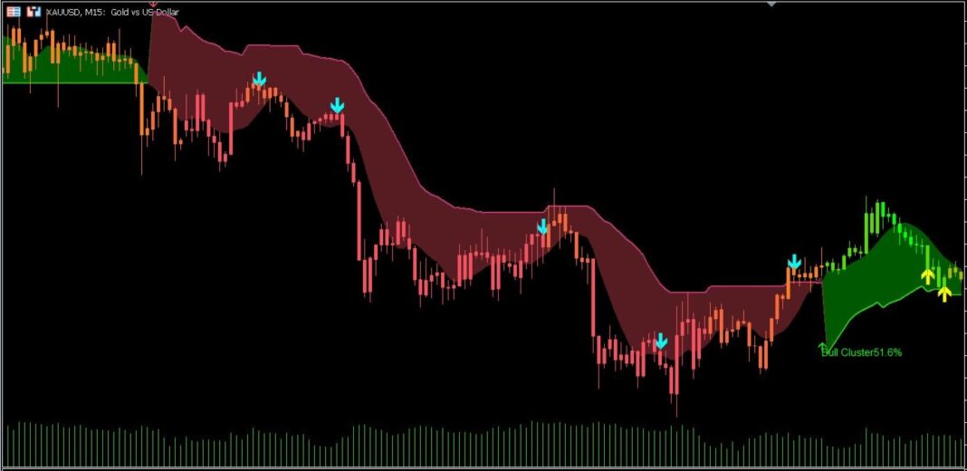 Yellow arrows (โ–ฒ) point out robust lengthy entry factors. Cyan arrows (โ–ผ) point out robust quick entry factors. These seem when the cluster consensus shifts.