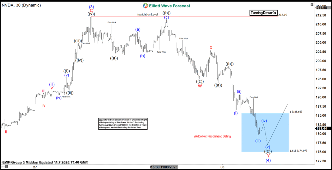 Right here’s the 1-hour Elliott wave chart from the 11.07.2025 Noon replace. Wherein, the cycle from the 21 April 2025 low led to wave (3) at $212.19 excessive. Down from there, the inventory made a pullback in wave (4) to appropriate that cycle. The internals of that pullback unfolded as Elliott wave double three construction the place wave W ended at $195 low. Wave X bounce ended at $202.92 excessive & wave Y managed to succeed in the blue field space at $185.66- $174.97. From there, consumers had been anticipated to seem on the lookout for the following leg increased or for a 3 wave bounce minimal.