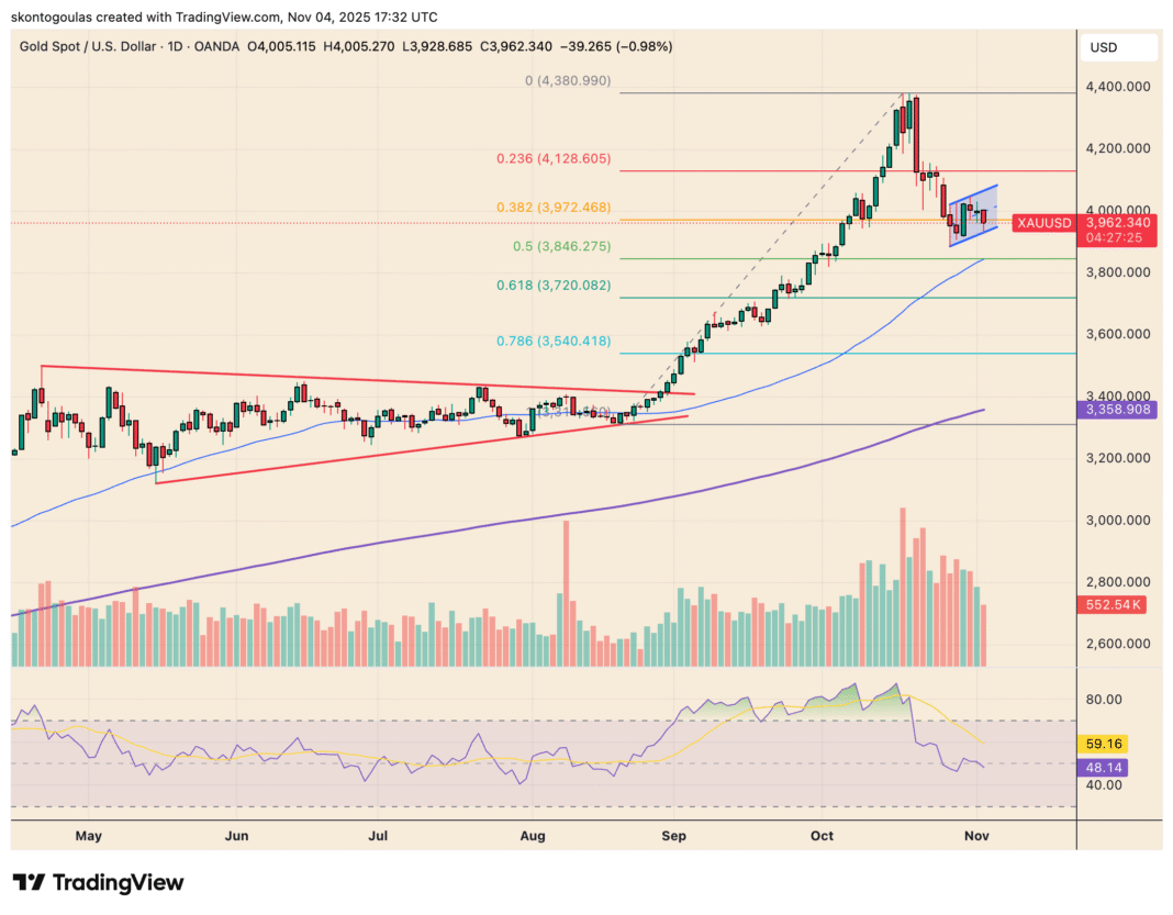 Gold peaked at $4,400 in October 2025 and corrected sharply decrease. We’re at present buying and selling just under $4,000 and shifting inside what seems like a bearish flag. If confirmed, this transfer might run to the 61.8 fib at $3,720 and maybe even the 78.6 at $3,540.
