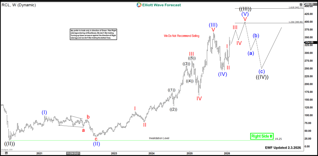 Royal Caribbean Cruises Ltd (NYSE: RCL) is a world cruise business chief. This text analyzes its weekly Elliott Wave construction. Our examination uncovers the present bullish path and key targets forward of the following correction.
