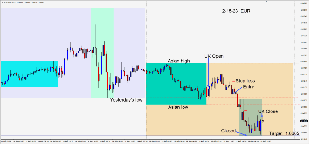 A brief was taken risking 15 pips for a possible 46 pips to our every day goal at 1.0665. Value moved to its Asian session low, paused awaiting the U.S. financial releases then moved decrease to our goal space the place we exited the commerce.