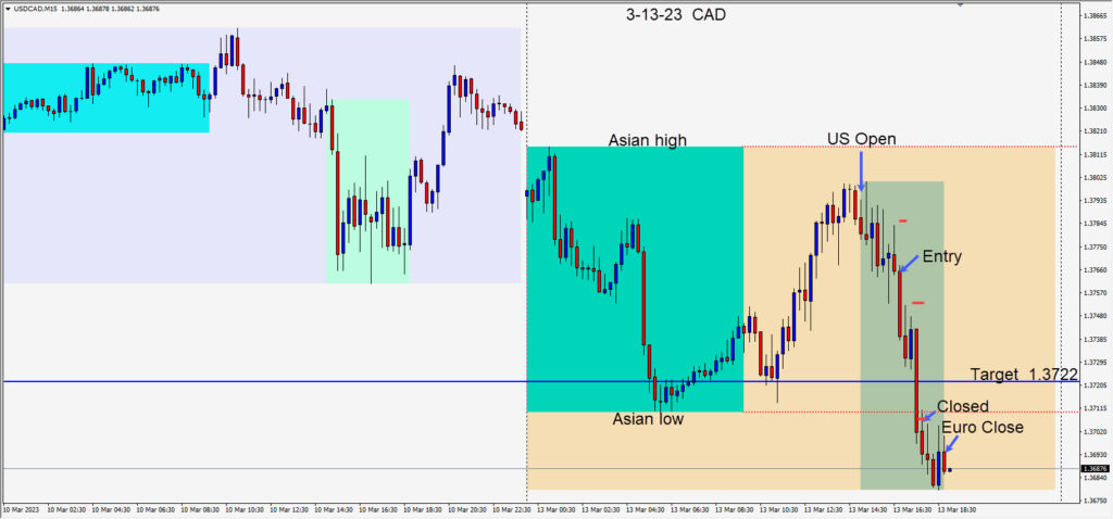 The DXY began the buying and selling week shifting downward with bond yields plummeting, and a USDCAD brief was taken risking 20 pips for a possible 43 pips to our first goal at 1.3722. Worth stored happening after it reached our goal degree, so we positioned our revenue cease decrease. Our second goal was the Asian session low round 1.3709 and anticipating a bounce as we neared the determine at 1.3700 we closed the commerce. Worth continued decrease with out us… making a big dip earlier than retracing.