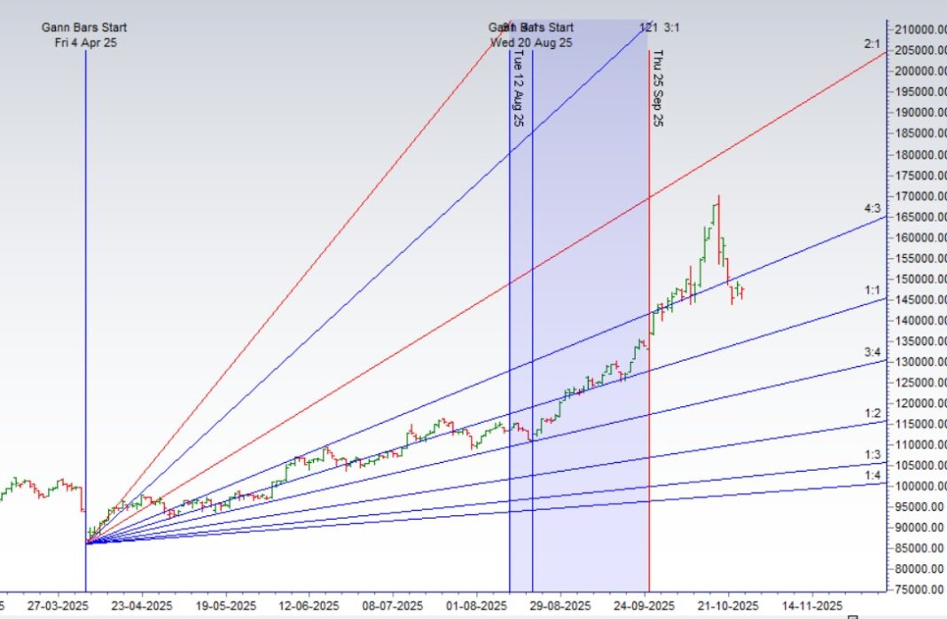 Silver has damaged its 4×3 gann angle resistance zone break of 144 Okay can see a sharper pullback