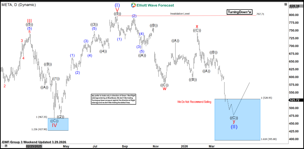 META exhibits a accomplished impulsive sequence, adopted by a three-wave corrective pullback. Now it helps the case for a near-term bounce. The minimal goal has been achieved. From right here, we enable the market to verify path whereas positioning for what might evolve right into a a lot bigger transfer.