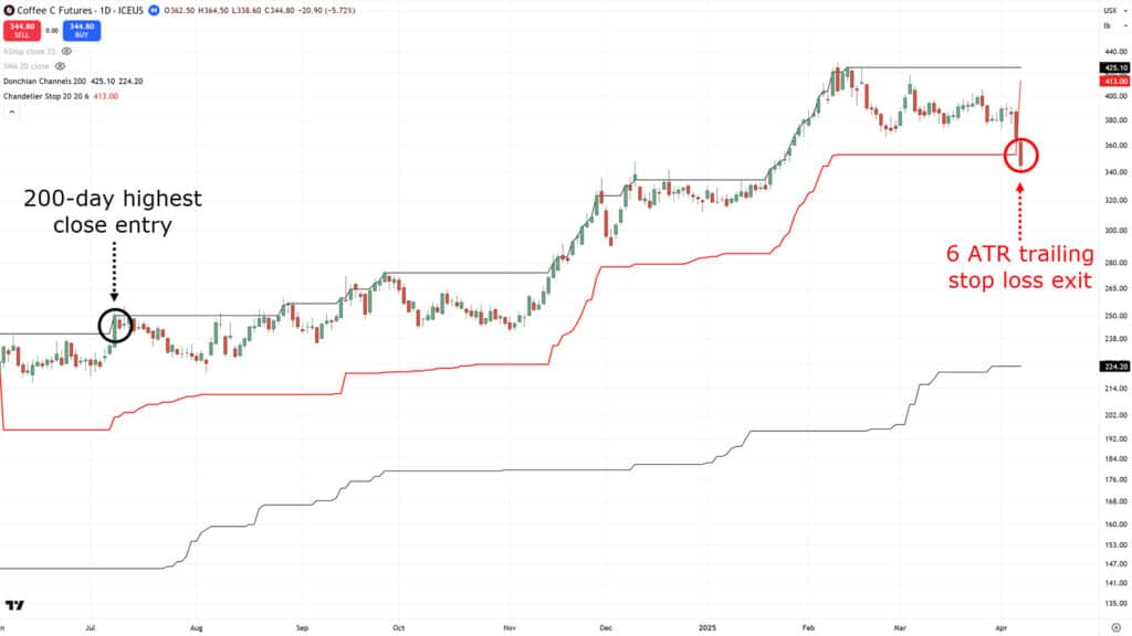 On this case, the commerce labored in our favour, and also you held the place until the value hit your 6 ATR trailing cease loss on April 4, 2025. This could have netted you a acquire of 39% on the commerce.