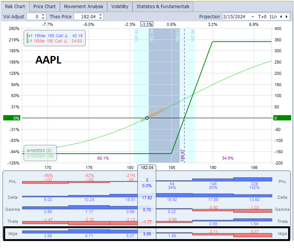 Let’s begin with the only of choices spreads, the put or name vertical unfold which is usually used as to position a commerce for a inventory to maneuver in a sure course. Right here’s a barely OTM (Out of The Cash) name vertical debit unfold on AAPL a few month away from expiration (a preferred unfold to play for inventory value to rise). The inventory value is $182 and the decision vertical is lengthy the 185 name and brief the 190 name. Word the highlighted Vega part that may illustrate some essential factors concerning IV: