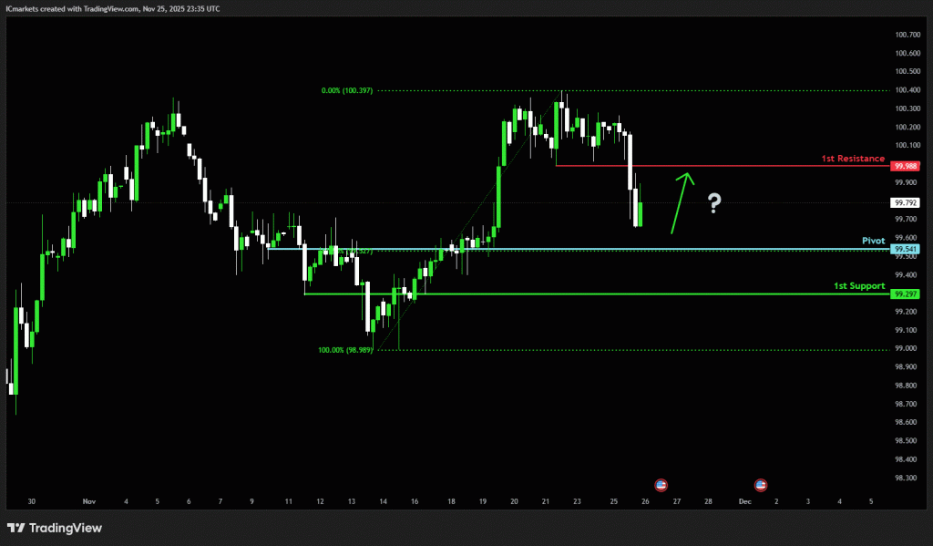 The value might see a short-term pullback towards the pivot earlier than persevering with its bearish transfer down towards the first assist.