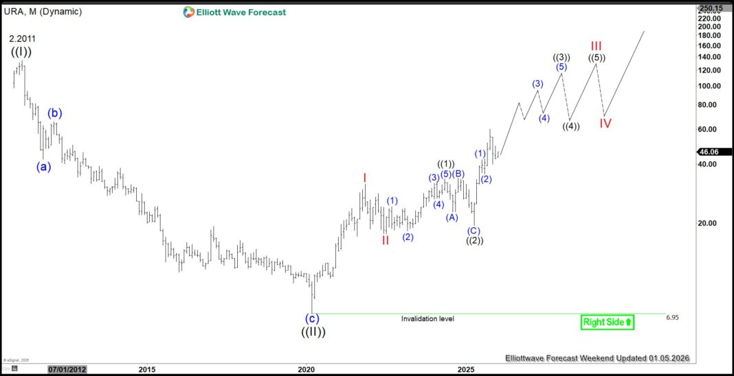 The month-to-month Elliott Wave chart of the Uranium Miners ETF (URA) signifies that wave ((II)) of the Grand Tremendous Cycle accomplished at $6.95. From this low, the ETF started a brand new wave ((III)) advance, unfolding as an impulsive construction with a nested sequence. From wave ((II)), wave I topped at $31.60, adopted by a corrective wave II that bottomed at $17.65. URA then shaped a nest with wave ((1)) peaking at $33.66 and wave ((2)) pulling again to $19.50. So long as URA holds above $19.50, and particularly above the important thing pivot at $6.95, pullbacks are anticipated to search out assist.