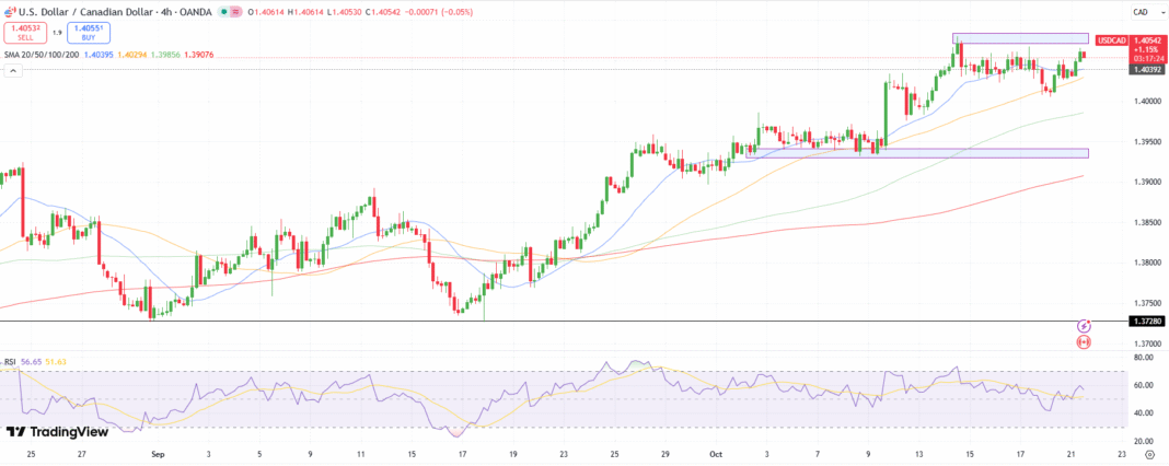 The USD/CAD 4-hour chart signifies that the pair hovers above the 1.4050 stage, after repeated pullbacks round 1.4070, reflecting a modest bullish bias. The pair continues to commerce above the important thing shifting averages. Moreover, investor curiosity stays agency on delicate dips, signaling market confidence.