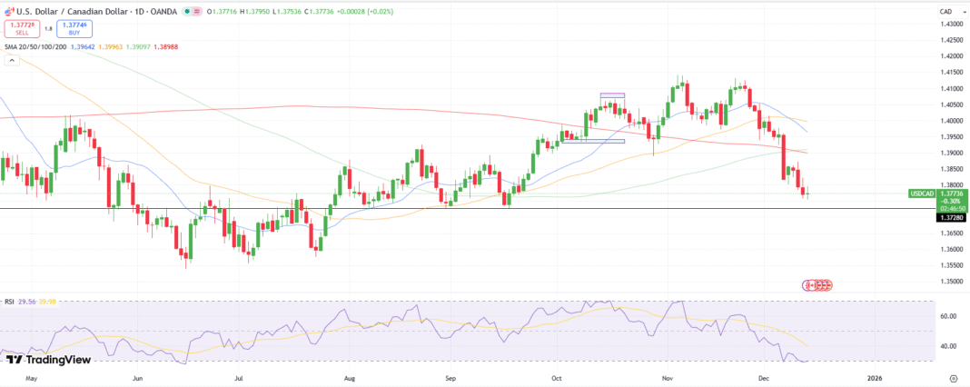The USD/CAD closed the final week barely decrease, shedding round 0.40%, close to the mid-1.3700 space because the US-Canada macro divergence widened. The important thing catalyst was a subdued US greenback amid softening labor market indicators, together with jobless claims and weaker non-public hiring, mixed with improved danger sentiment.