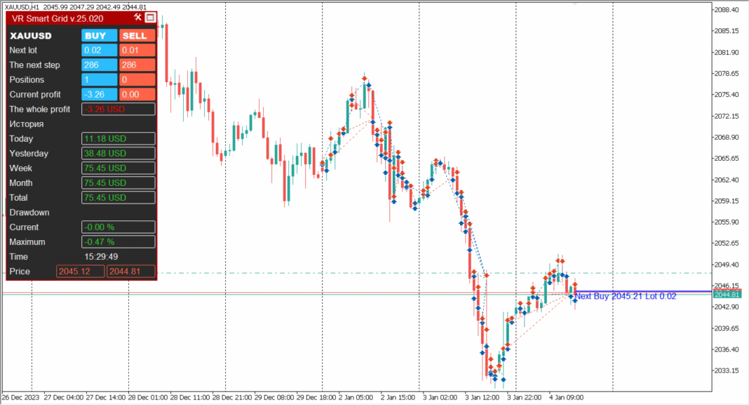 ट्रेडिंग रणनीति के काम का एल्गोरिदम बाज़ार पोज़ीशनों के प्रबंधन और समायोजन पर आधारित है। उदाहरण के लिए, ऊपर की ओर ट्रेंड होने पर खरीद की पोज़ीशन के लिए एक्सपर्ट एडवाइज़र ट्रेलिंग‑स्टॉप का उपयोग करता है। जैसे ही Cease Loss स्तर लाभ क्षेत्र में आ जाता है, एक्सपर्ट एडवाइज़र एक अतिरिक्त पोज़ीशन खोलेगा। इस रणनीति का लक्ष्य ट्रेडिंग के जोखिम को न्यूनतम करना है। गिरते हुए ट्रेंड की स्थिति में, एक्सपर्ट एडवाइज़र निर्धारित लॉट और स्टेप के साथ औसत निकालने के लिए पोज़ीशन खोलता है। थोड़े से भी रिट्रेस पर VR Sensible Grid पूरी ग्रिड की पोज़ीशनों को धीरे‑धीरे छोटी‑छोटी हिस्सों में बंद करना शुरू कर देता है।