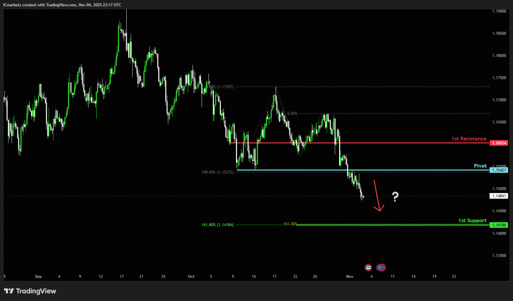 The value might see a short-term pullback towards the pivot earlier than persevering with its bearish transfer down towards the first help.