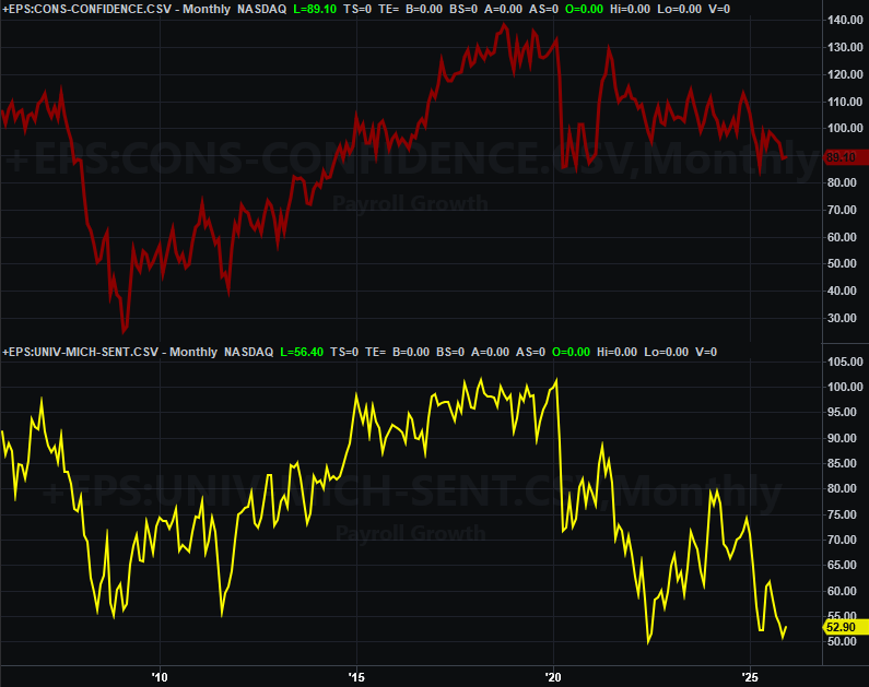 The Convention Board’s comparable client confidence rating is due on Tuesday of this week. Forecasts counsel a slight enchancment, however just like the Michigan quantity, there’s not sufficient enchancment anticipated to really change the continued deterioration in how individuals really feel in regards to the foreseeable future. They’re nonetheless largely unhopeful. Curiously although, this pessimism isn’t but being mirrored by the inventory market itself.