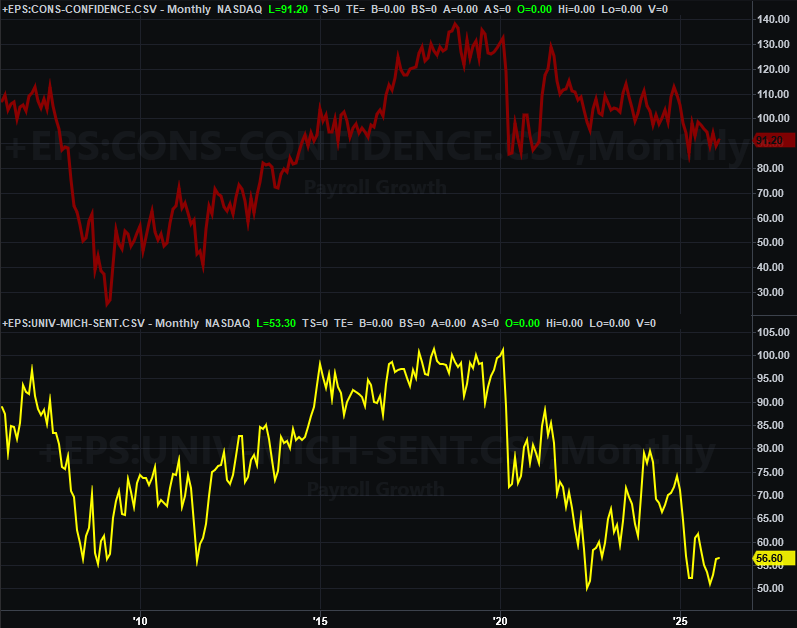 There was actually just one report of any main curiosity launched final week. That’s the College of Michigan’s shopper sentiment information. Though not but proven on out chart under, it fell from February’s studying of 56.6 to 53.3 for March,